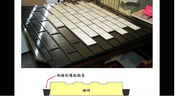 This method is applicable to ceramic tiles with large size and thick thickness; In practice, the space required for the arrangement of ceramic tiles is made of rubber mold, and then the rubber mold is placed in the steel mold of prefabricated components; The ceramic tile space of the rubber mold and the size of the ceramic tile seam rib should consider the ceramic tile error and the tightness of the ceramic tile placement, which should not be too large or too small. Therefore, the statistical analysis of the ceramic tile size should be done when the ceramic tile enters the factory; In addition, if the tile seam rib of the rubber mold is made into an inverted trapezoid, it will help to absorb the tile error and control the tightness, like picture 14