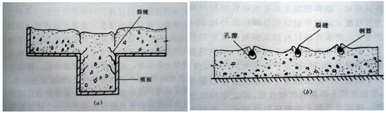 如图-13示,某工地梁板结构的裂缝情况,当时天干风大,浇筑后未及时覆盖,混凝土表面迅速失水开裂,当时混凝土并未初凝,但用压抹的方法已无法使裂缝闭合,操作人员采用木榔头敲砸的方法企图使裂缝闭合,出现了图示三种情况。由此可以看出,早期塑性裂缝在发现及时、处理得当的情况下,是可以避免的。